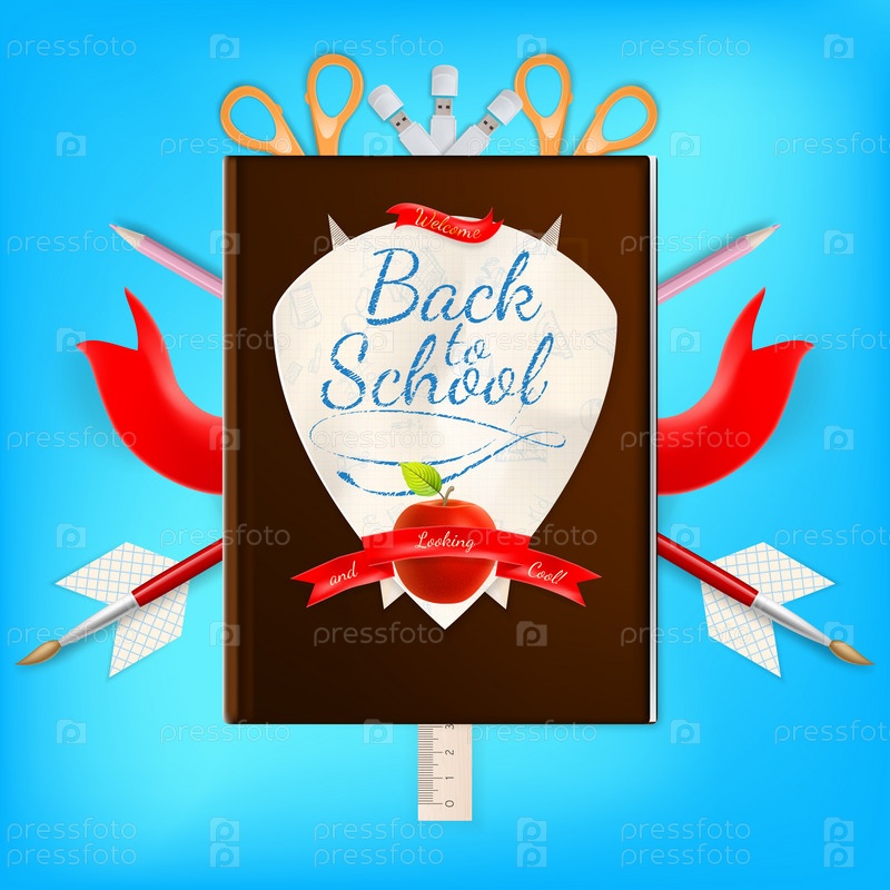 Герб с надписью 'Назад в школу' и школьные принадлежности. EPS 10