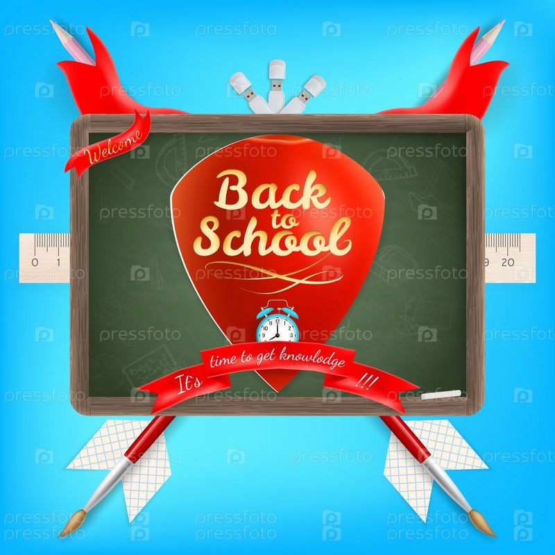 Герб с надписью 'Назад в школу' и школьные принадлежности. EPS 10