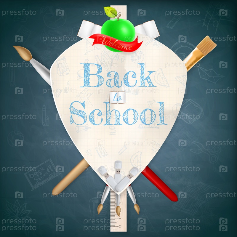 Герб с надписью 'Назад в школу' и школьные принадлежности. EPS 10
