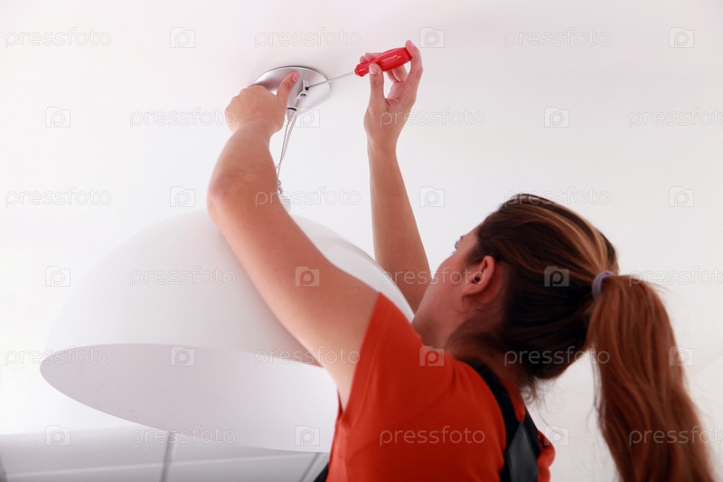 Женщина крепит люстру на потолке