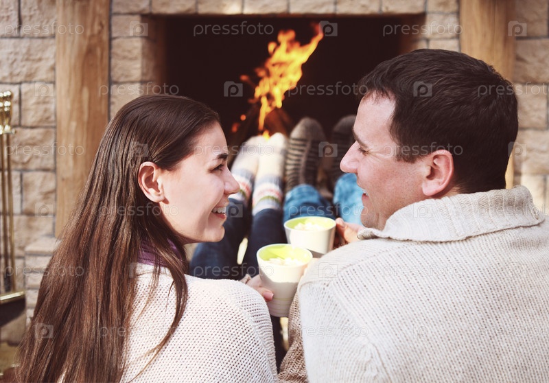 Пара пьет горячий шоколад перед камином