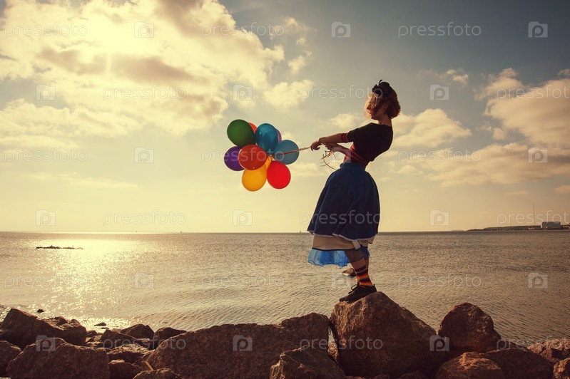 Девушка с воздушными шарами на берегу