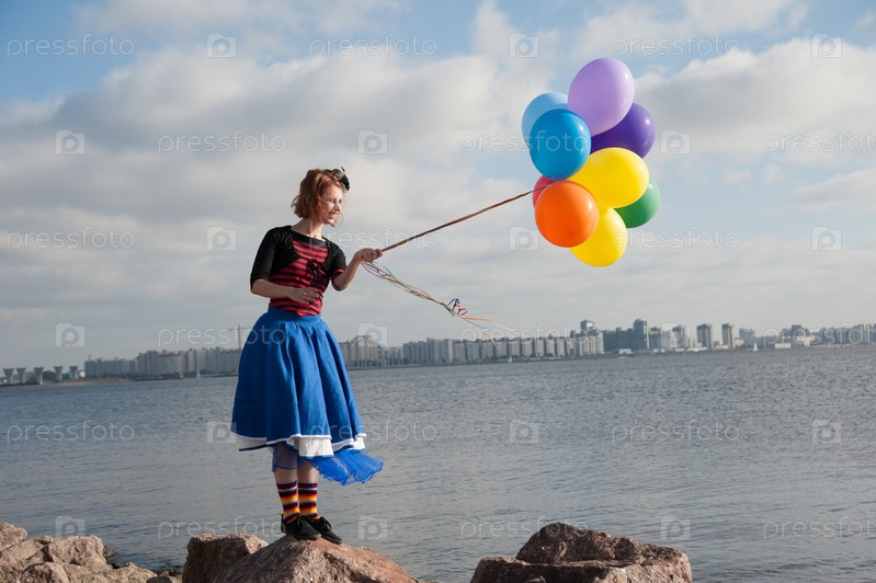 Девушка с воздушными шарами на берегу