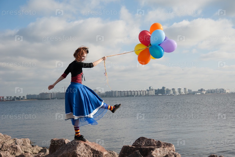 Девушка с воздушными шарами на берегу