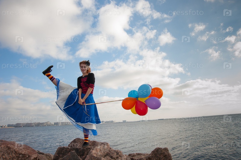 Девушка с воздушными шарами на берегу