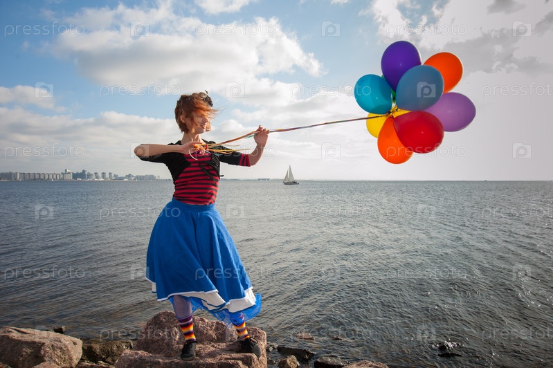 Девушка с воздушными шарами на берегу
