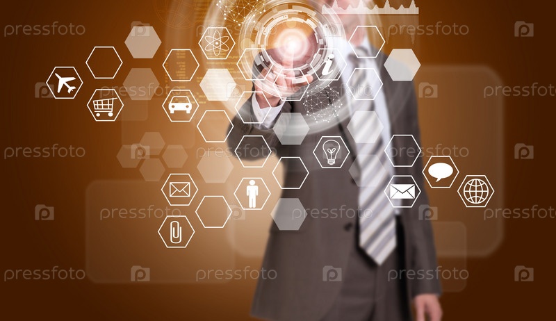 Бизнесмен нажимает виртуальную кнопку