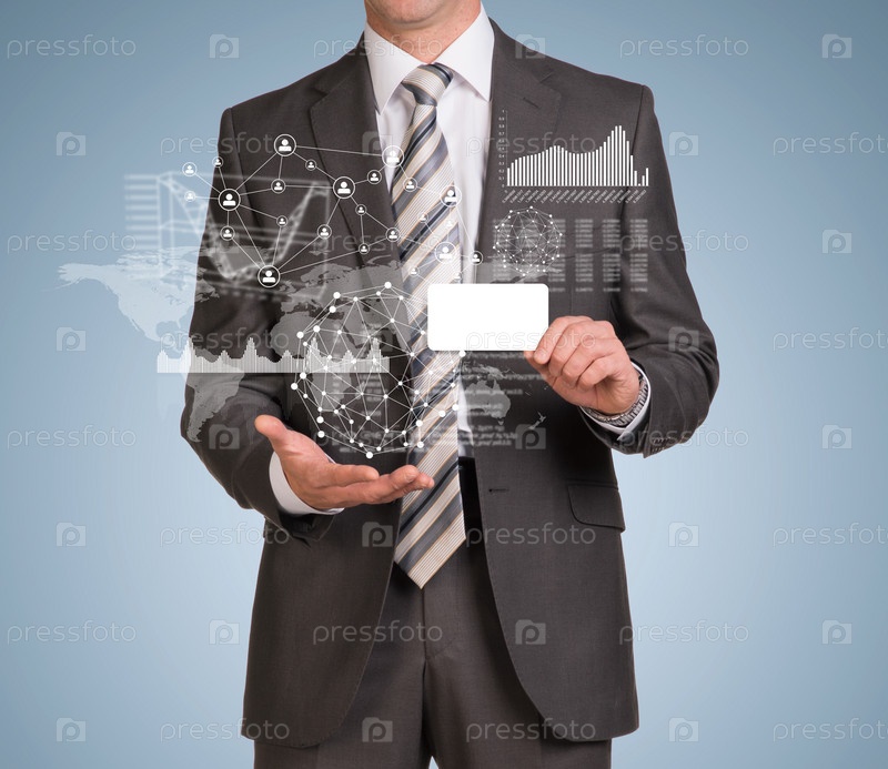 Бизнесмен держит визитку, и графики
