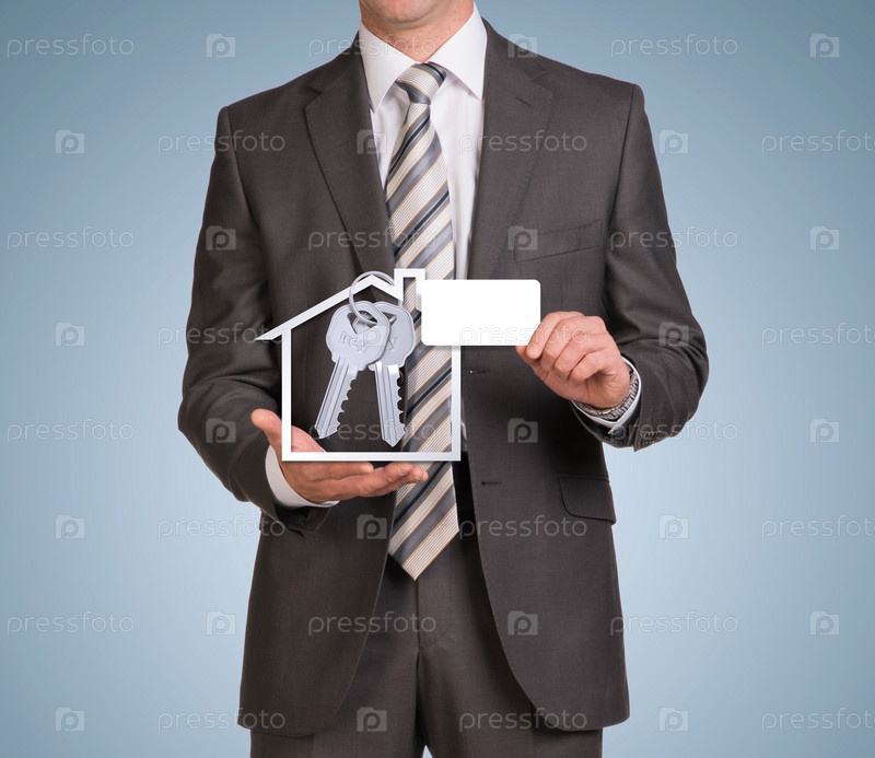 Бизнесмен держит визитку и дом