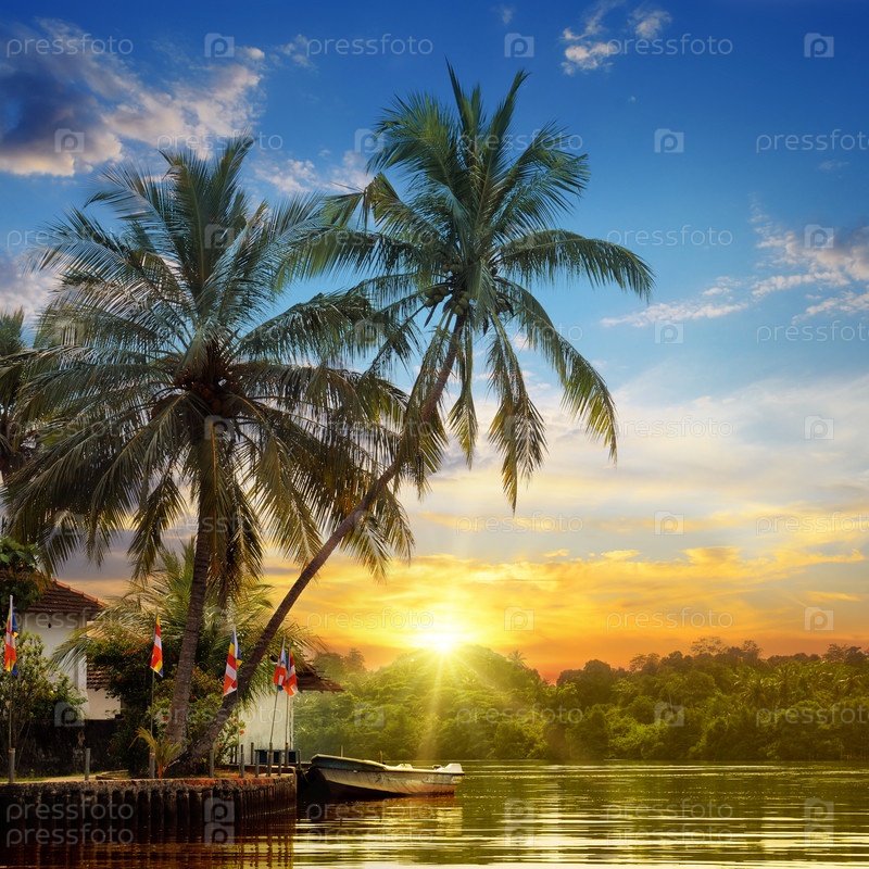 Красивый рассвет и тропические пальмы на реке