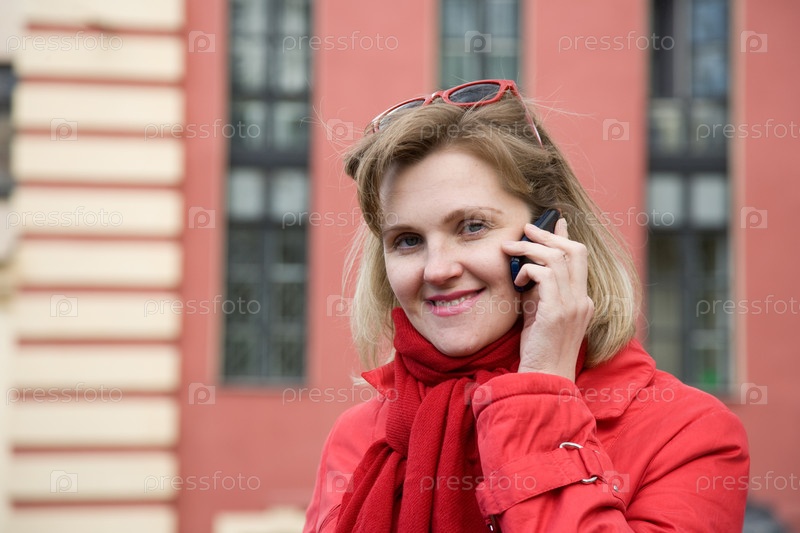 Женщина в красной куртке говорит по мобильному телефону