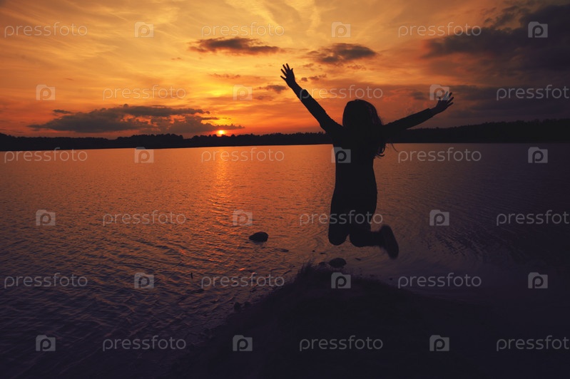 Силуэт женщины на берегу на фоне заката