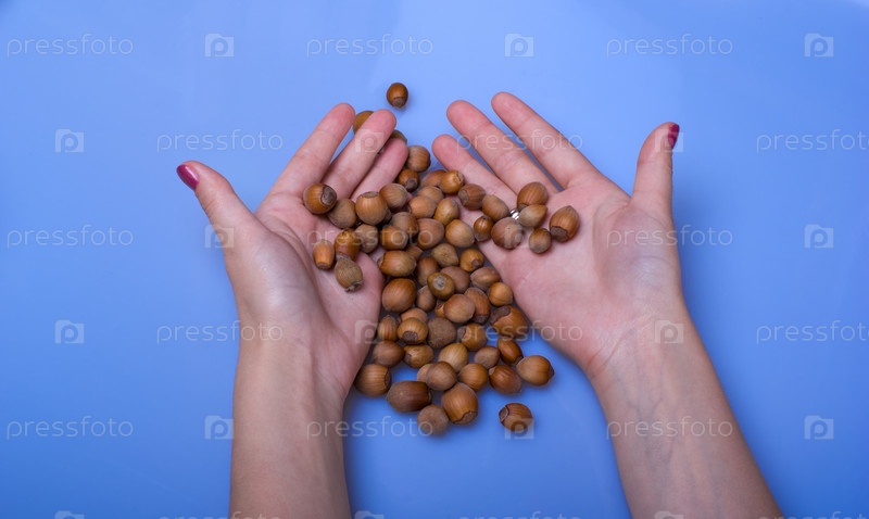 Женские руки и рассеянные деревянные орехи на синем фоне