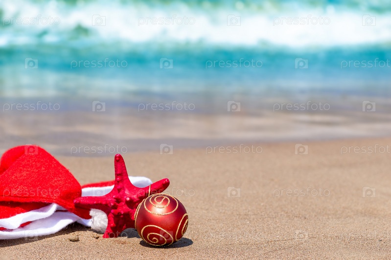 Колпак Санты и елочная игрушка на песке у моря
