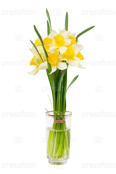 Букет нарциссов в стакане с водой, изолированный на белом фоне