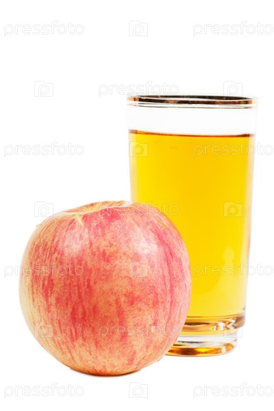 Свежий яблочный сок в стакане и красное яблоко на белом фоне