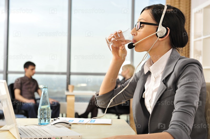 Молодая девушка в наушниках из колл-центра пьет воду