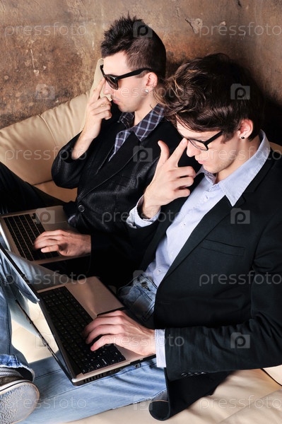 Двое мужчин сидят на диване с ноутбуками