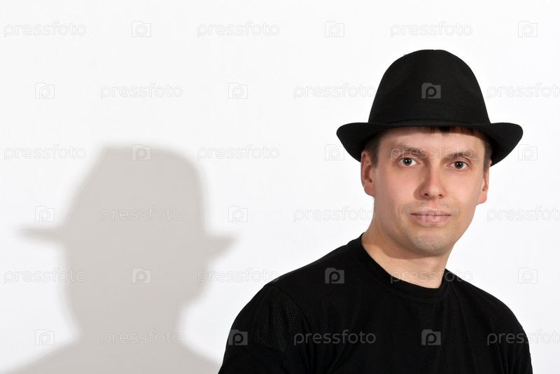Человек в черной шляпе и его тень на белой стене
