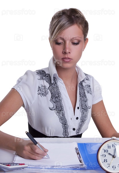 Деловая женщина за столом с документами и будильником