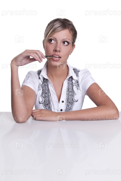 Задумчивая молодая женщина сидит за столом