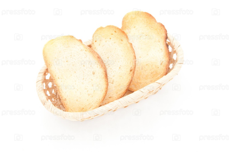 Поджаренные ломтики хлеба в плетеной корзинке на белом фоне
