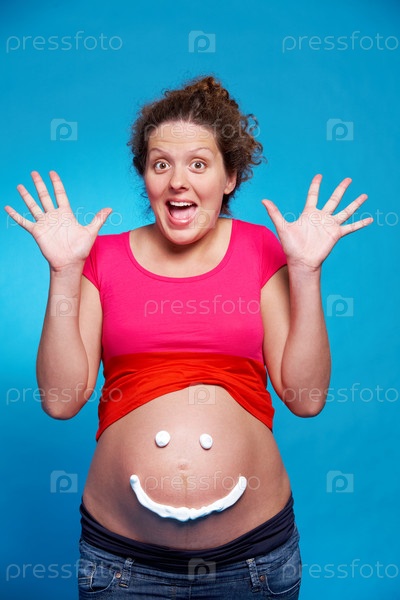 Беременная женщина с улыбкой на животике