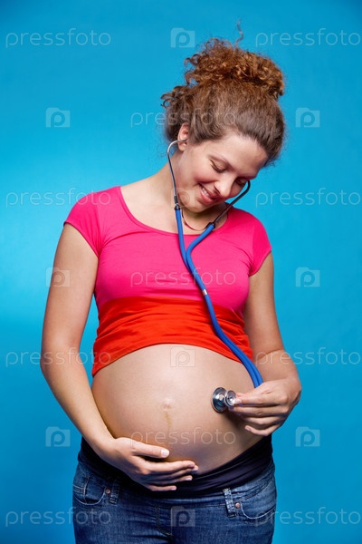 Беременная женщина слушает своего ребенка в животике стетоскопом