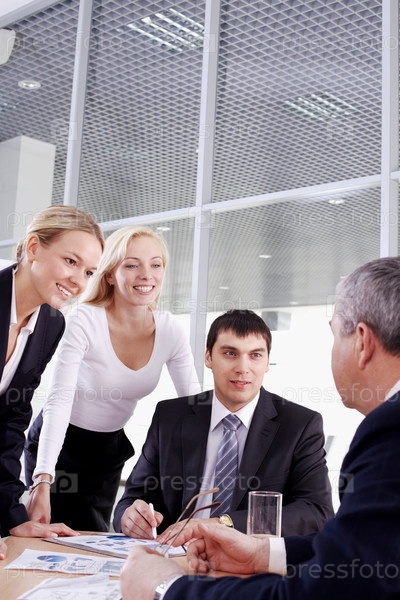 Четверо успешных предпринимателей обсуждают рабочие вопросы в офисе