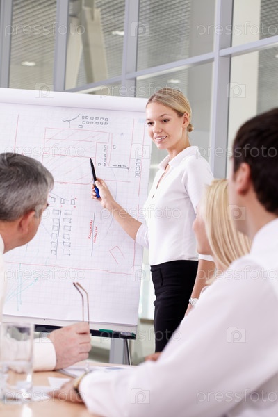 Бизнес-леди проводит презентацию для своих коллег в офисе