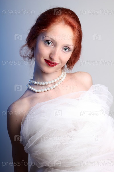 Красивая рыжая девушка в белом шифоне