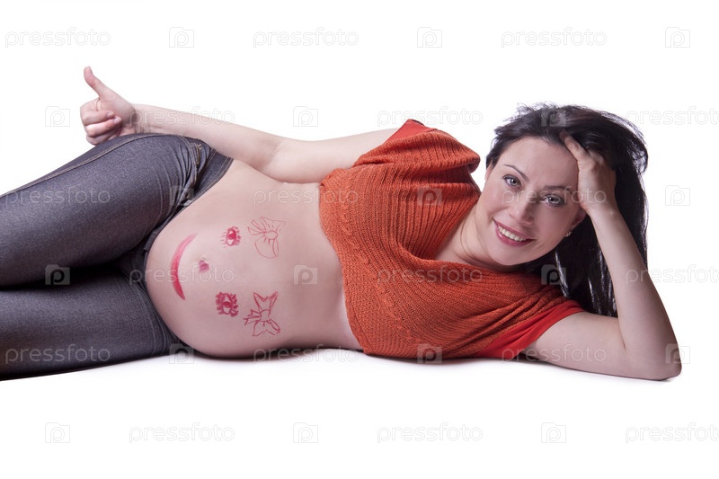 Беременная женщина с разрисованным животиком лежит и показывает большой палец