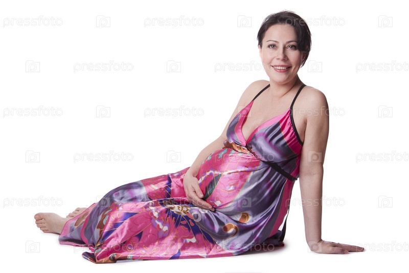 Беременная женщина в длинной розовой сорочке сидит на белом фоне