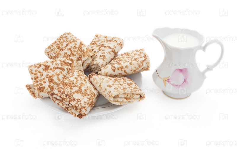 Блинчики с начинкой и кувшинчик с молоком на белом фоне