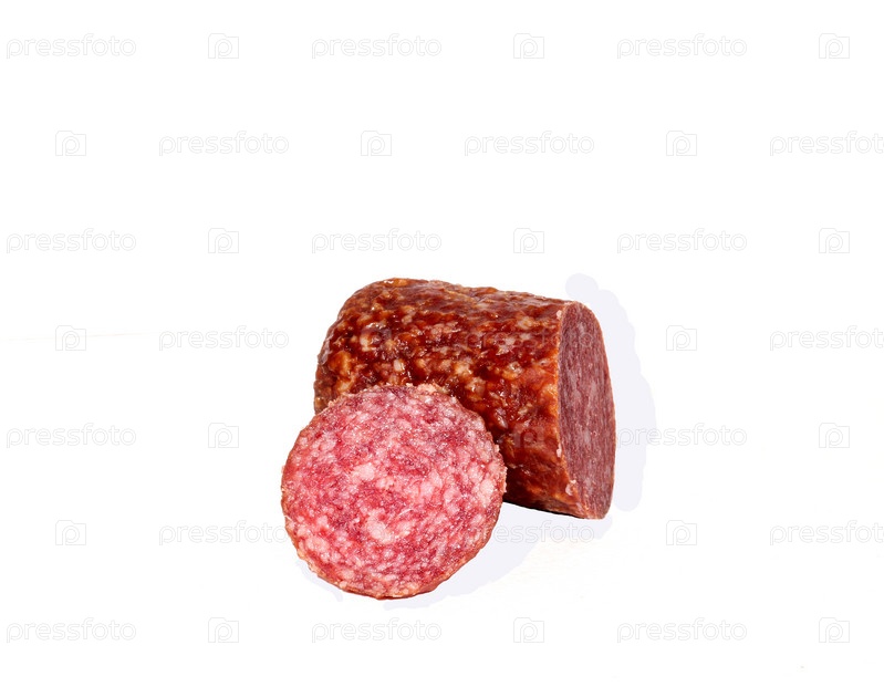 Сырокопченая колбаса на белом фоне
