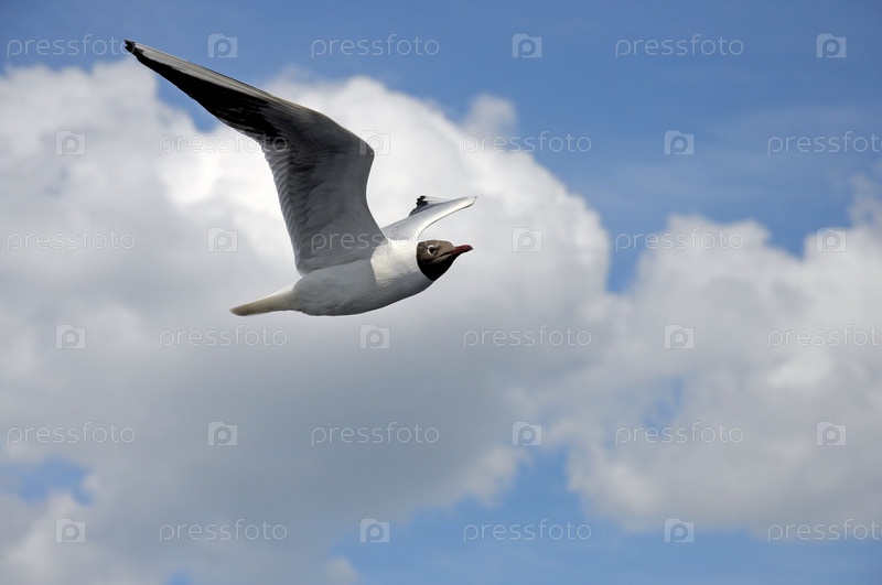 Одна чайка в полете на голубом небе