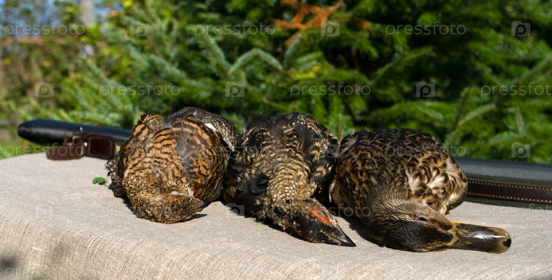 Охотничье ружье - утка и черные гризы на столе