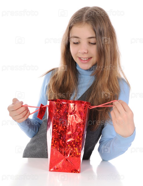 Девочка-подросток рассматривает подарок на белом фоне