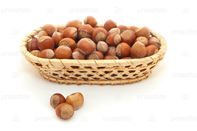 Фундук в плетеной корзинке на белом фоне