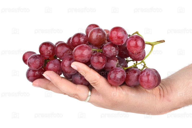 Гроздь розового винограда сорта "кардинал" на ладони на белом фоне