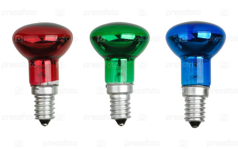 Красная, зеленая и синяя лампочки накаливания на белом фоне