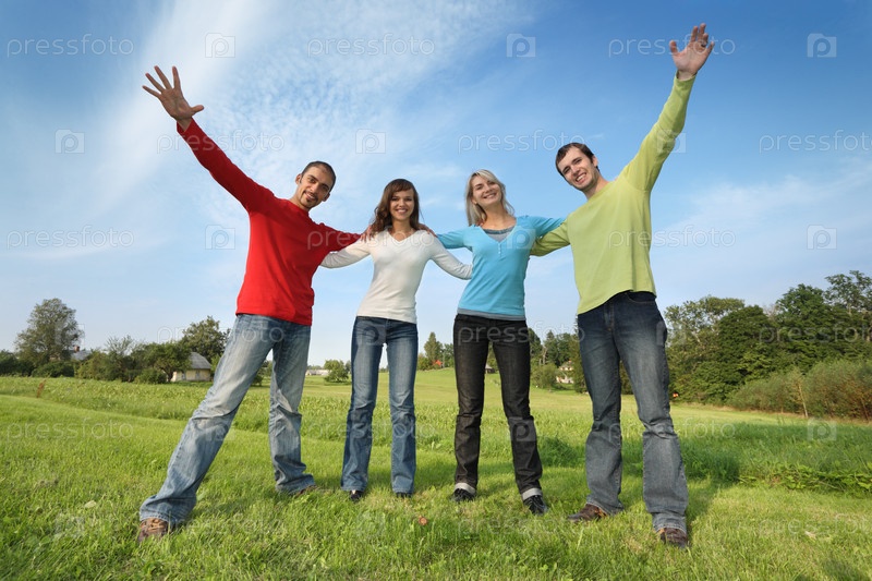 Группа из четырех счастливых друзей вместе на улице на зеленом поле