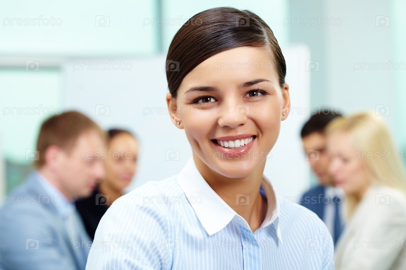 Успешная счастливая бизнес-леди на фоне своих коллег в офисе