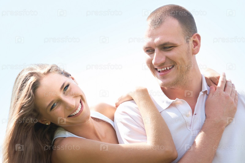 Влюбленные мужчина и женщина на фоне голубого неба