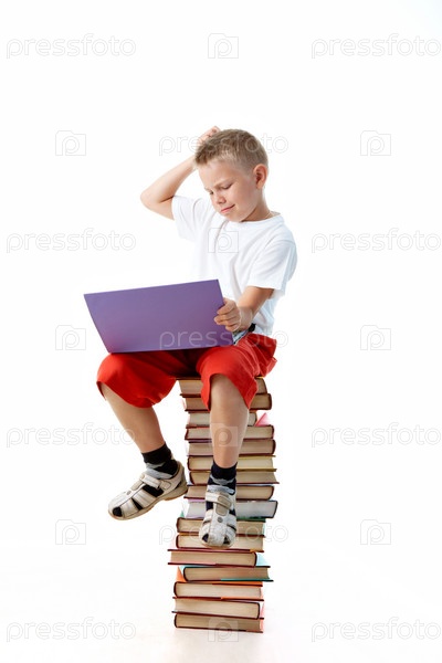 Мальчик школьного возраста сидит на стопке книг с ноутбуком