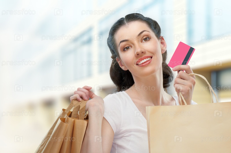 Красивая женщина с покупками и кредитной картой в руках