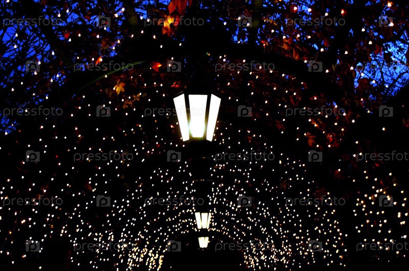 Уличный фонарь и гирлянды на фоне вечернего неба