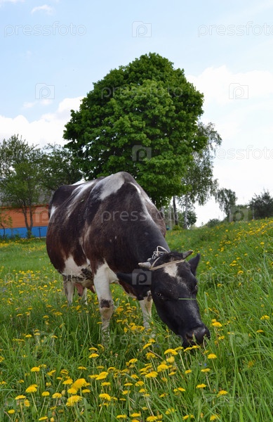 Корова пасется на лужайке