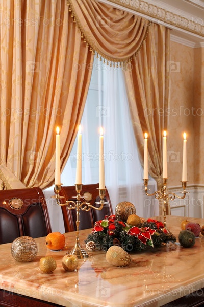 Стол со свечами и рождественскими украшениями