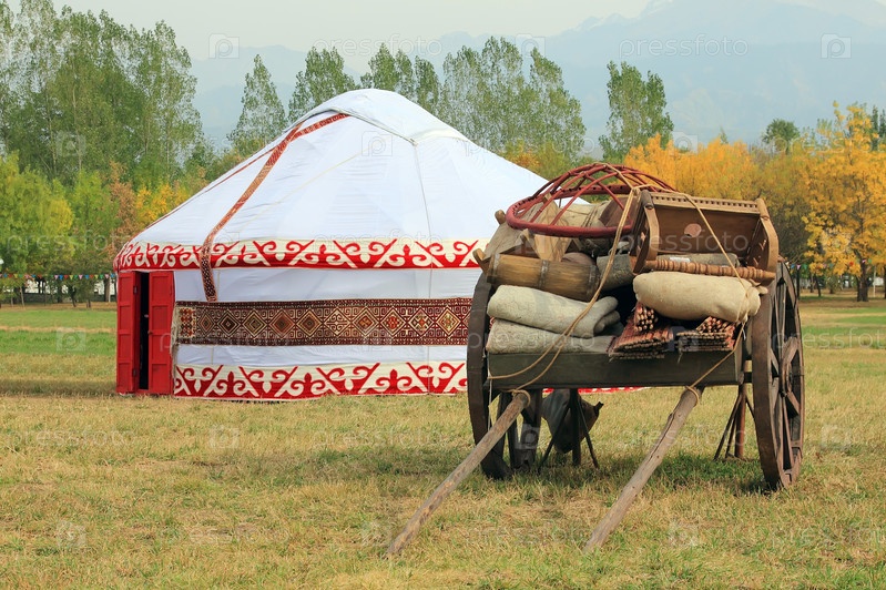 Арба с уложенной юртой на фоне установленной юрты